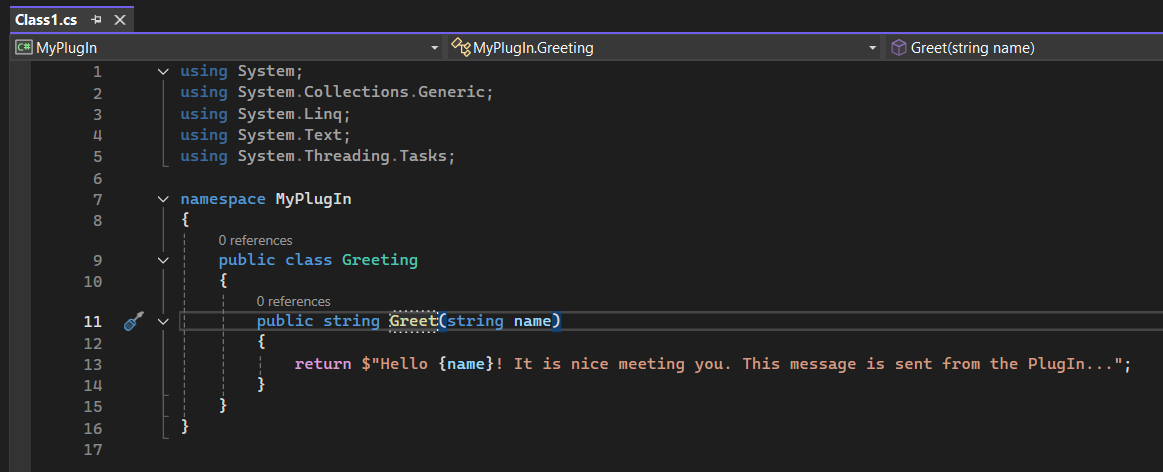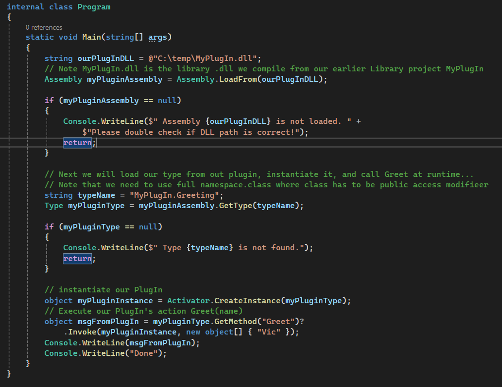 Next, we will create a sample console application that will load this plugin dll which I will store it at c:\temp\MyPlugIn.dll and will instantiate its type and execute its Greet(name) function from the PlugIn at run-time.
