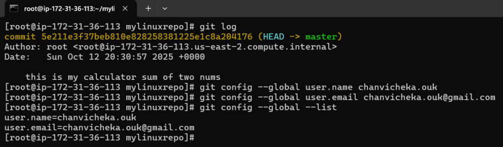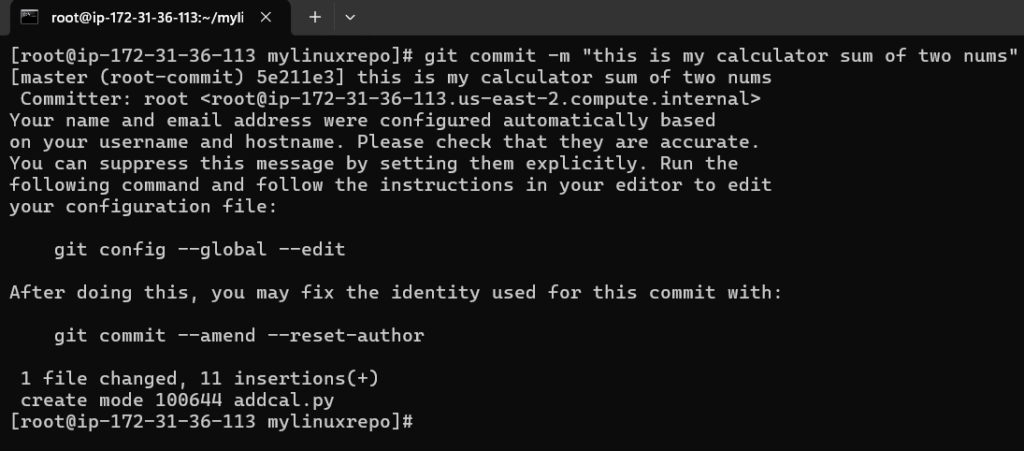 Note that I forgot to set the git config –global user.name and git config –global user.email