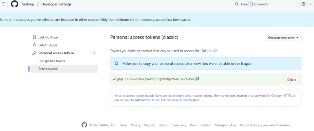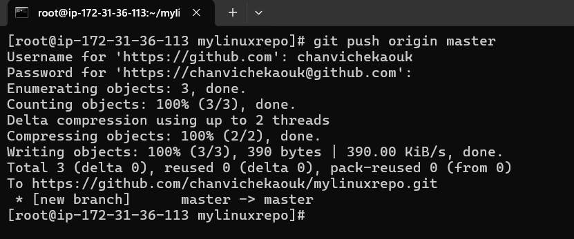 When prompt with Password, past the copied token and here we now successfully link and push our local change in our local git repo to the remote github repo: