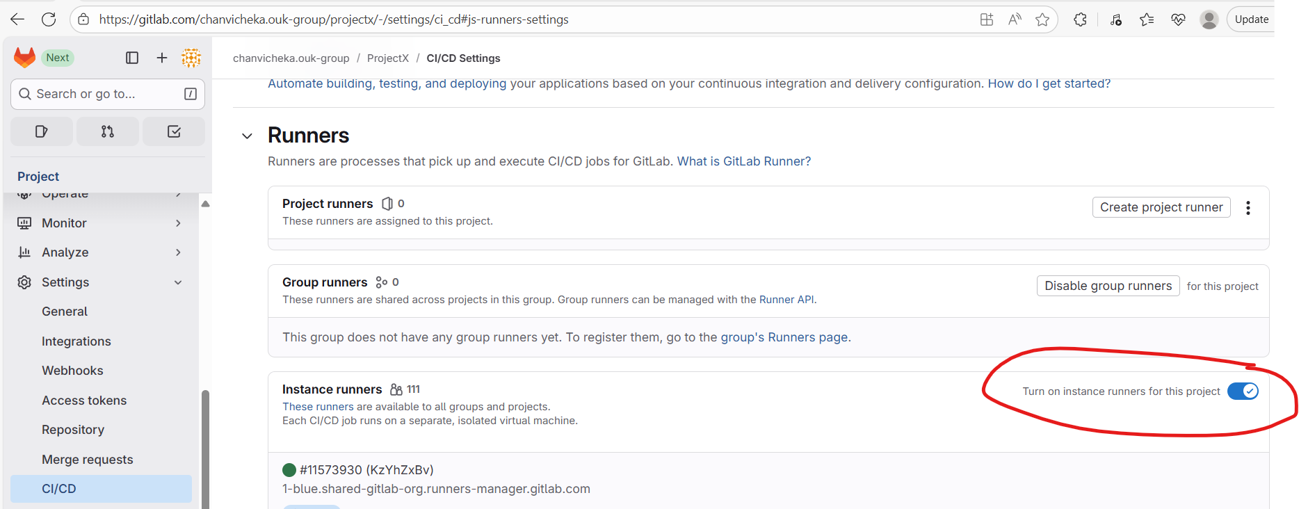 Go to our project’s repository, then navigate to Settings → CI/CD → Runners, and disable the instance (SaaS) runners by toggling them off.