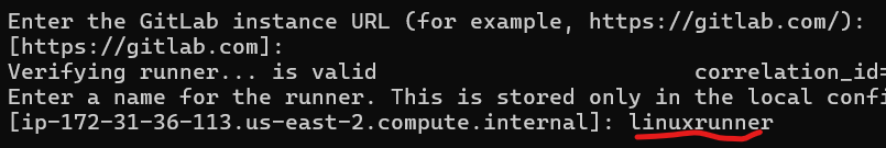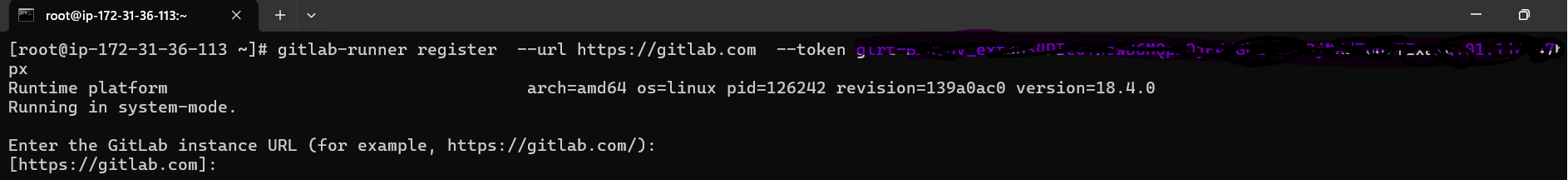 And copied and paste the following command at our aws ec2 cloud instance (amazon linux) to register it there (to link them: Gitlab <-> aws ec2 linux runner instance)