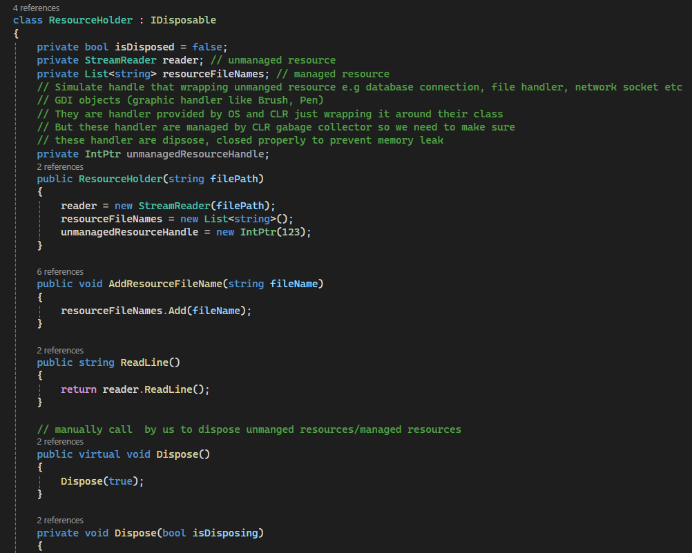 Above, I have a class ResourceHolder that implemented IDisposable interface