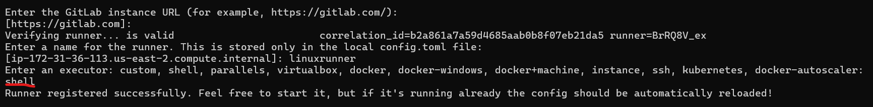 next type shell for the executor and hit enter (since this is a simple demonstration of the setup of self-managed runner, we chose shell for our .gitlab-ci.yml’s script aka bash, but if you want you can choose vm, or docker etc and chose by typing the executor type here)
