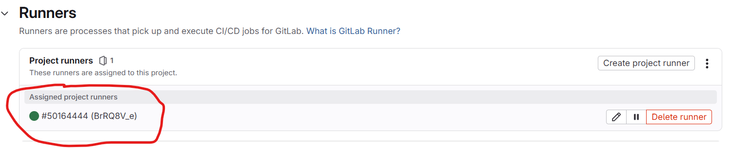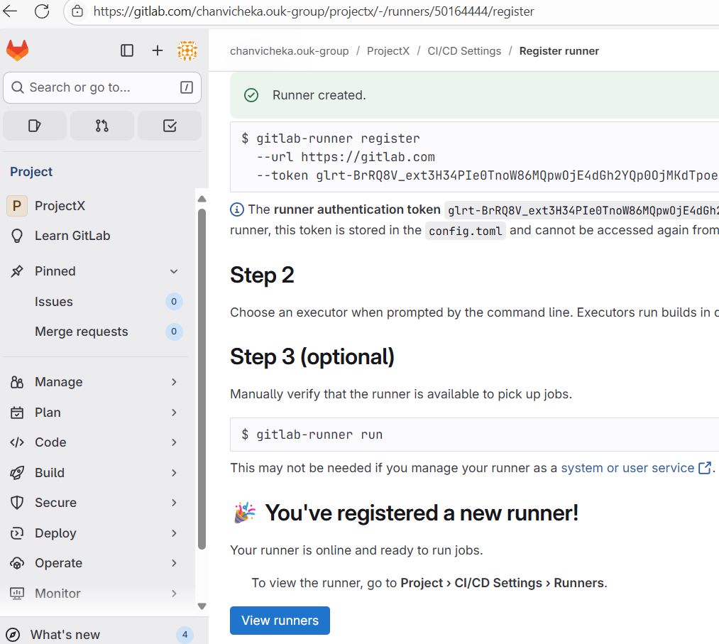 Click on View runners and we should see our project runner is registered successfully and online (green means it is online)