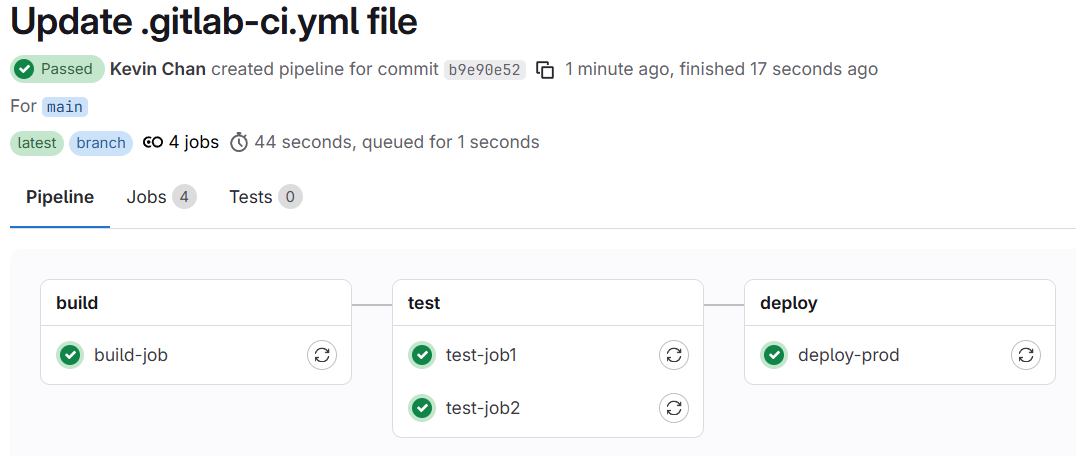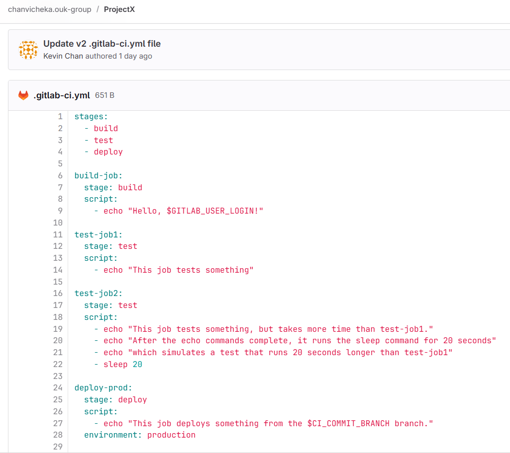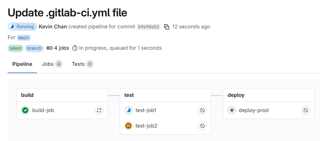 Note that our simple .gitlab-ci.yml is as below: 3 stages (build, test, deploy), 1 build job, 2 test jobs, and one deploy job.