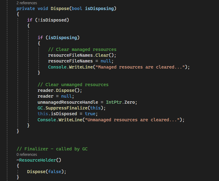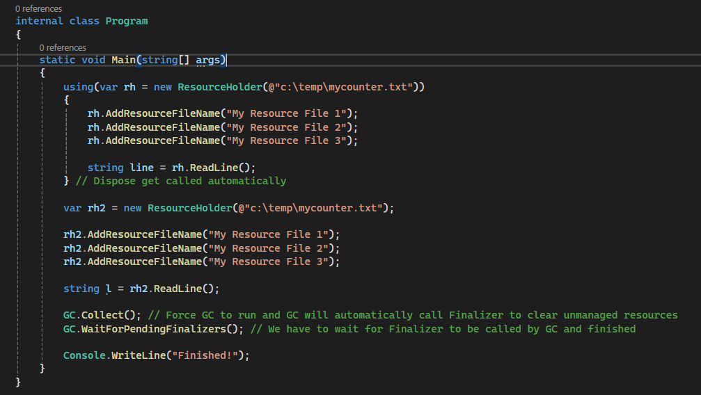 We also instantiate 2nd object of ResourceHolder rh2 but this time we will use finalizer so we will have to force GC to run by calling GC.Collect and wait for it to finish before ending our demo program with GC. WaitForPendingFinalizers();