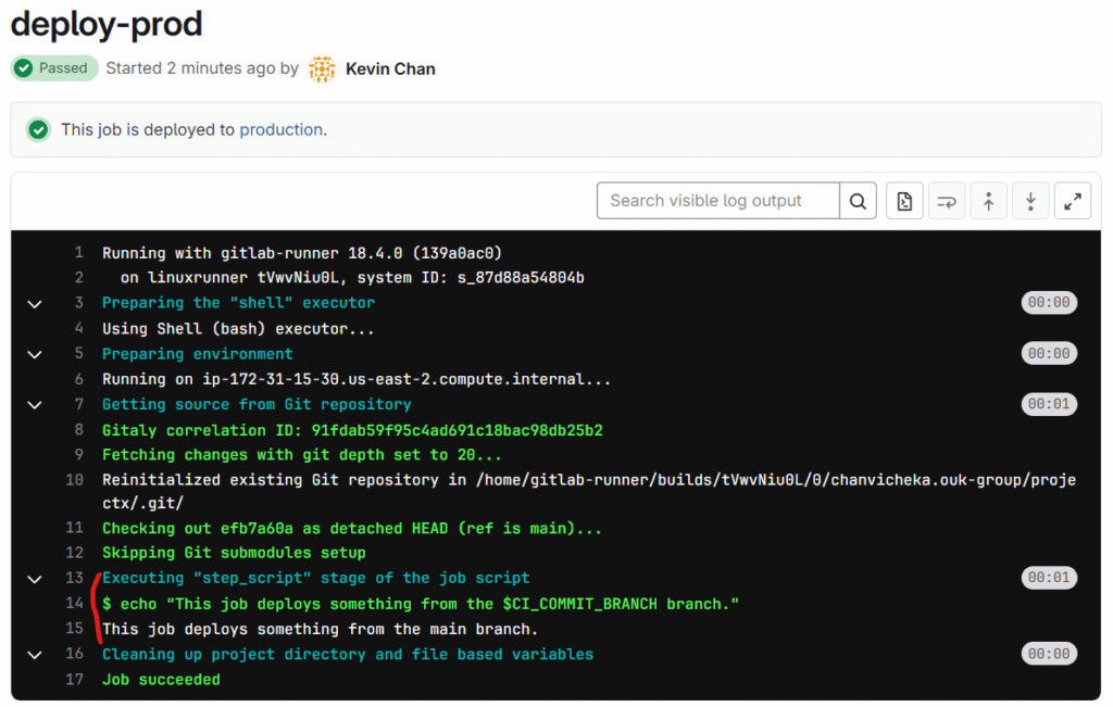 deploy-prod: stage: deploy script: - echo "This job deploys something from the $CI_COMMIT_BRANCH branch." environment: production