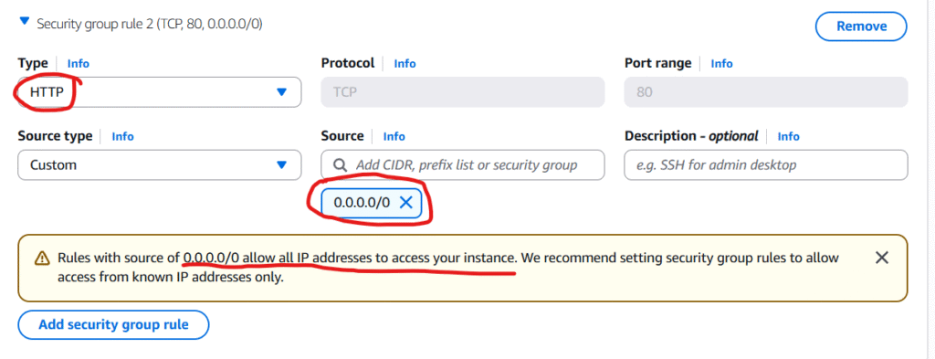 In Network settings section, we are going to click on Edit and Click Add security group rule