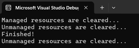 In our main program, we instantiate first object of ResourceHolder rh with using {…} which the compiler knows that it will have to call Dispose method automatically at the end curly bracket.